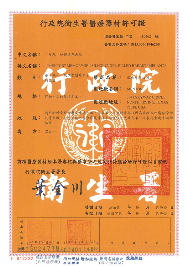 ※ 詳情請參閱:衛署醫器輸字第019462號,”曼陀”矽膠填充義乳仿單