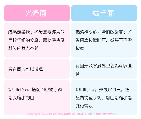 隆乳的植入義乳材料也是影響因素之一,通常來說絨毛面的隆乳義乳,揉捏的觸感上會比較紮實;光滑面的隆乳義乳則為相對更柔軟的材料。最後Demi選擇了光滑面義乳(“曼陀”矽膠填充義乳;許可證號:衛署醫器輸字第019462號)