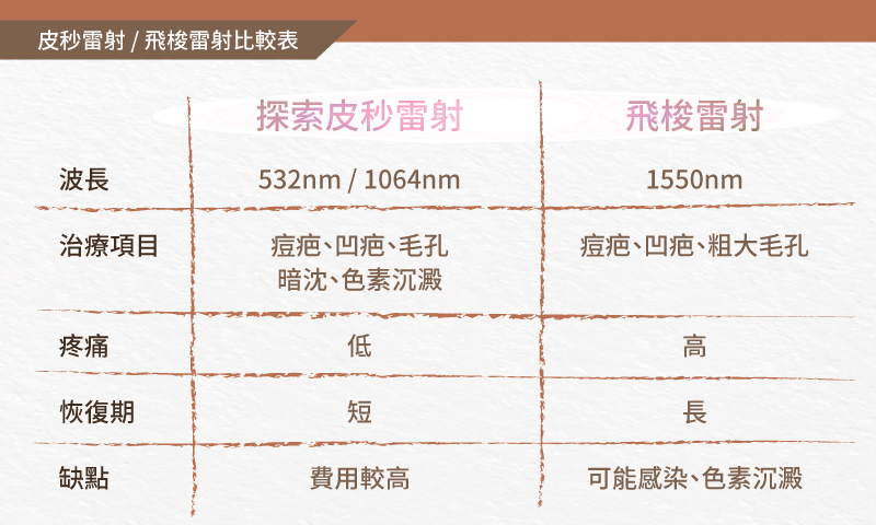 「飛梭」、「磨皮」的效果雖好,但因能量破壞性較大、發炎反應較劇烈,不僅治療過程痛感高,恢復期也較長,術後照護不易,而令人畏懼卻步,照護不周還可能導致感染、色素沉澱等狀況。