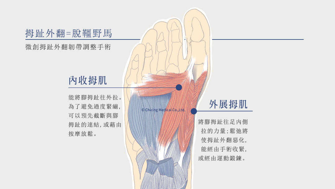 足部的外展拇肌和內收拇肌分別會將腳拇趾往足內側及足外側拉;正常情況下,兩股力量可以相互抵消平衡,使腳拇趾維持在合理的位置上。一旦外展拇肌過度鬆弛、內收拇肌太緊繃,將導致腳拇趾歪斜偏移,甚至惡化到骨骼、關節變形的程度。